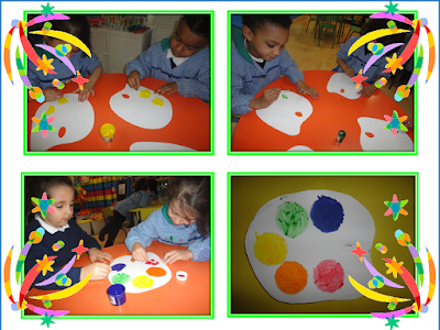 Elegimos vistosos colores para las manchas de pintura de los disfraces. Pintamos de colores las paletas de pintores y elegimos los pinceles con los que llenaremos de color el carnaval.
